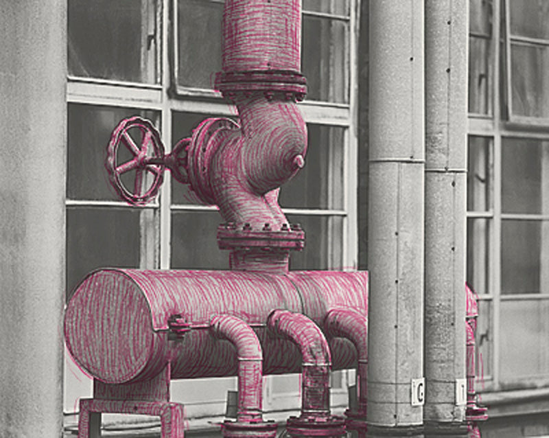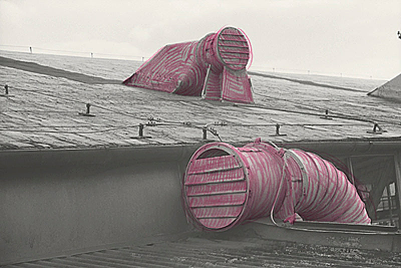 Leporelo as a photographic series from the ‘factory’ environment of Zlín highlights the new air conditioning and ventilation ducts in photographs of the original factory architecture. Through personification, the pipes, ducts and chimneys of the ventilation systems begin to move, we feel the rhythm of breathing, the animal existence focused on intake to intake and excretion. With naturalistic interest, we can follow the life of the mysterious Rourouns inhabiting the industrial buildings. (from the text of the catalogue),