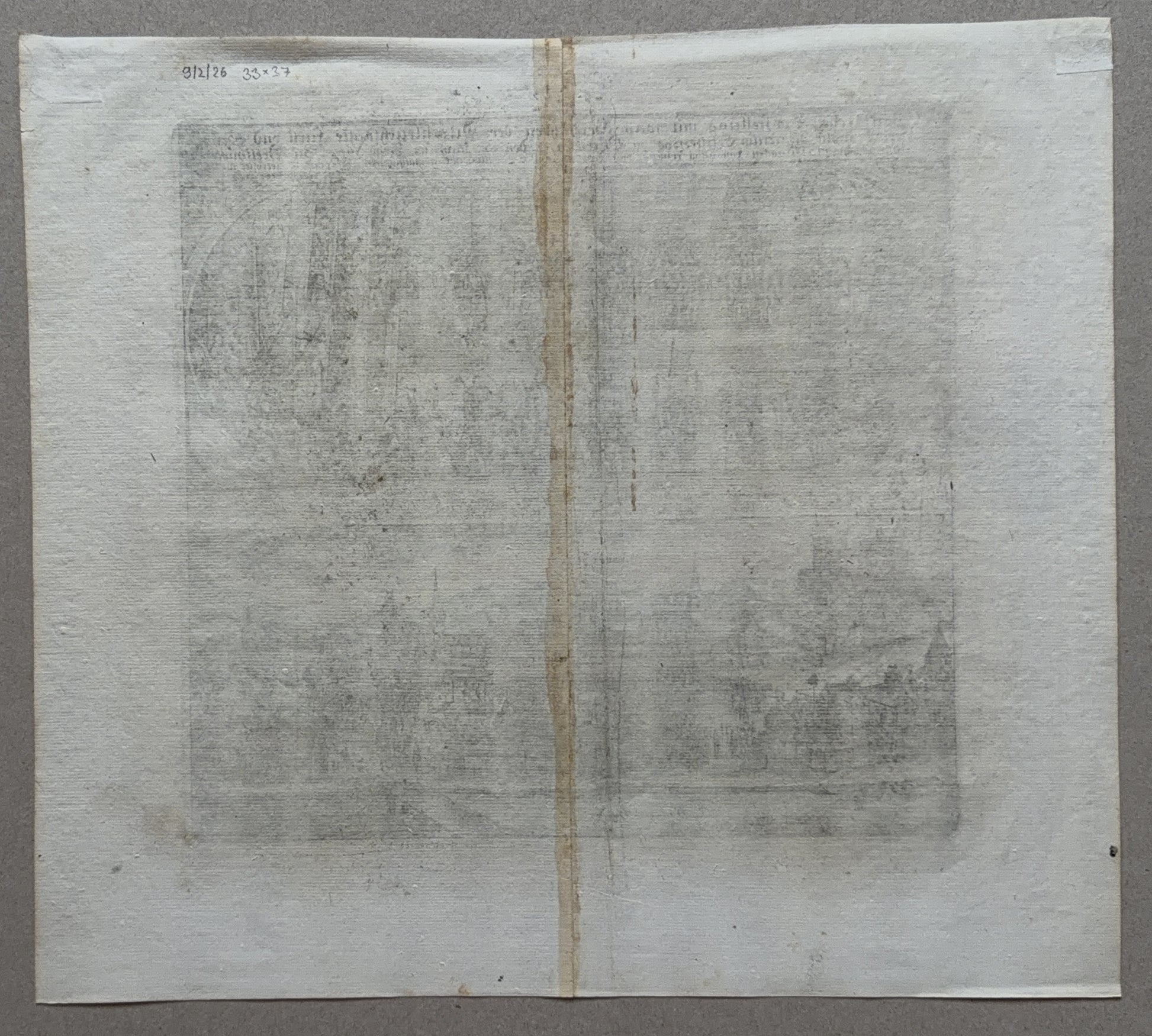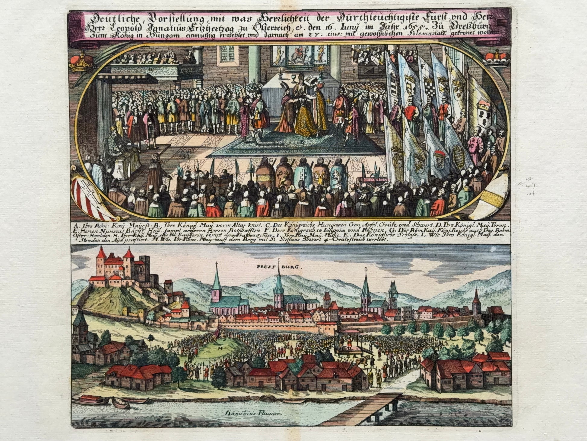 This is authentic graphic material documenting the coronation. Some copies were subsequently hand-colored. The detailed drawing of the architecture, figures, and heraldic elements attests to the representative character of the work. The engraving is a high-quality graphic work of art. At a time when regular printing in the form of modern newspapers did not yet exist, it served as an important pictorial and textual medium. It made the event accessible to the royal court, the church, and the high nobility. However, the technical nature of copperplate engraving did not allow for high costs – the number of copies was limited to a few hundred, so it did not reach the wider public. The engraving is included in the collections of the Bratislava City Gallery (inv. no. C 7174) and is accessible via the Web umenia portal, which is operated by the Slovak National Gallery. It is also found in the collections of major international institutions such as the Bayerische Staatsbibliothek in Munich, the British Library in London, the Österreichische Nationalbibliothek in Vienna, and the Slovak National Library in Martin. Copies of this engraving can also be found in private collections around the world. This particular copy was purchased in an antique shop in Germany about ten years ago.