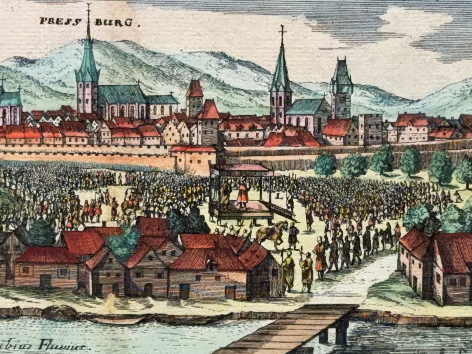 The lower part of the engraving shows a panorama of Bratislava at that time. The dominant feature is Bratislava Castle, which served as a repository for the Hungarian crown jewels. These were stored in the castle's Coronation Tower. The crown jewels were carried to St. Martin's Cathedral in a solemn procession under the supervision of designated dignitaries and armed guards. Below the castle, you can see the city walls and towers, with the Danube in the foreground. The army, nobility, and burghers are gathered in front of the city. This is the secular phase of the coronation celebrations, which followed the liturgical ceremony. The newly crowned monarch then moved to the Coronation Hill (mons coronationis), where he drew his sword and turned to the four corners of the world as a sign of defending the country. The hill stood on the site of today's Reduta building (Slovak Philharmonic).