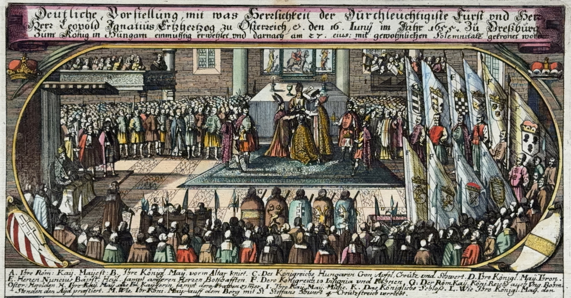 The upper part of the engraving depicts the interior of the cathedral during the coronation ceremony itself. In the center of the composition, the young monarch stands on a raised platform in front of the altar. The Archbishop of Esztergom, as the highest ecclesiastical dignitary in Hungary, performs the anointing and coronation. The Hungarian coronation regalia – the Holy Crown, the scepter, the orb, and the coronation sword – are depicted at the altar. The composition is strictly hierarchical. The monarch is surrounded by magnates, representatives of the estates, court dignitaries, and clergy. The audience is gathered in the upper gallery of the cathedral and in the background. At the bottom of the sheet is the title of the engraving in German: "Deutliche Vorstellung, mit was Herrlichkeit der Durchleuchtigste Fürst und Herr Leopold Ignatius Ertzhertzog zu Oesterreich, den 16. Junij im Jahr 1655 zu Pressburg zum König in Ungarn einmüßig erwählt und darauff am 27. ejusdem mit gewöhnlichen Ceremonien gekrönet worden." (A clear depiction of the glory with which the most illustrious prince and lord Leopold Ignatius, Archduke of Austria, was unanimously elected King of Hungary in Pressburg on June 16, 1655, and then crowned with the usual ceremonies on the 27th of the same month.) The individual groups and persons depicted in the engraving are marked with a letter legend: A. Ihre Röm. Kay. Majest. (His Roman-Imperial Majesty), B. Ihre Königl. Maj. vorm Altar kniend (His Royal Majesty kneeling before the altar), C. Des Königreichs Hungarn Cron, Zepter und Schwert (Crown, Sceptre and Sword of the Kingdom of Hungary), D. Ihre Königl. Maj. Thron (Throne of His Royal Majesty), E. Herrn Nuncius Bapstl. (Papal Nuncio), F. Herr Erz-Bischof von Gran (Archbishop of Esztergom), G. Dero Königreichs Hungaria und Böhmen Herrn Botschafften (Envoys of the Kingdom of Hungary and Bohemia), H. Ihre Kay. Maj. Röm. Kay. Reichs-Augst. Erz-Bohm. (Representatives of the Roman-Imperial and Habsburg Lands), I. Ihre Königl. Maj. Hofstatt (Court of His Royal Majesty), K. Das Königl. Schloß (Royal Castle), L. Wie Ihre Königl. Maj. den Schwur thut (How His Royal Majesty takes the oath).