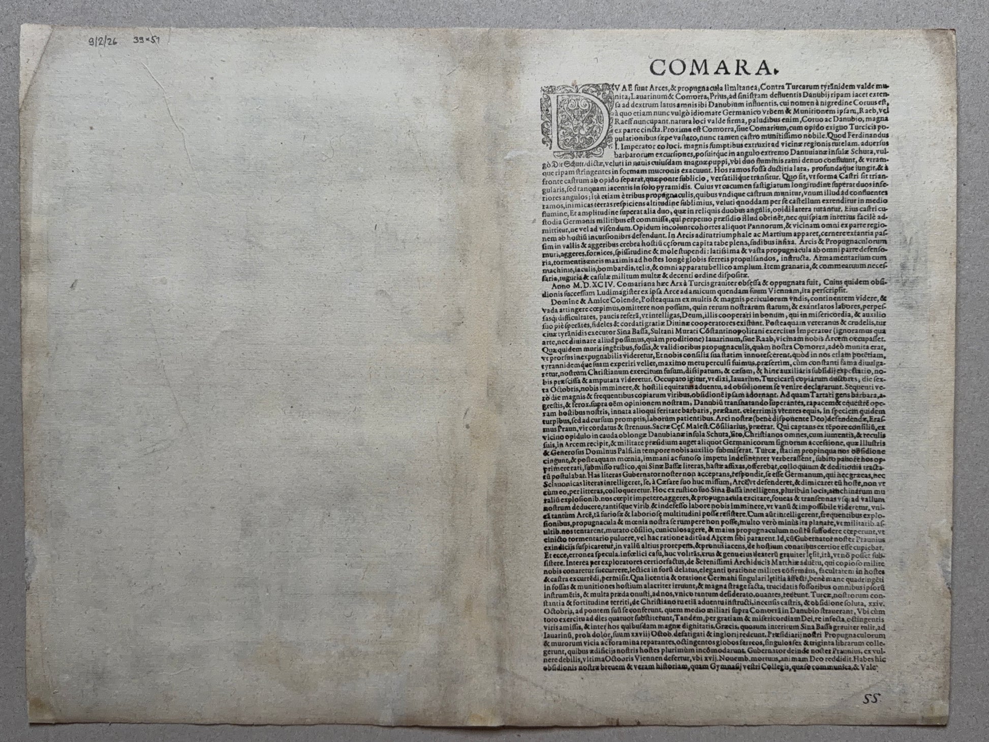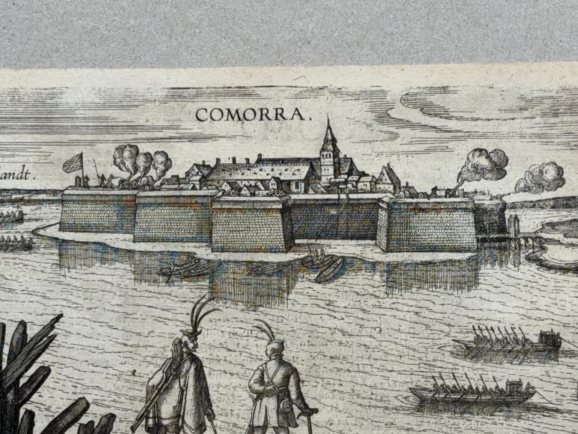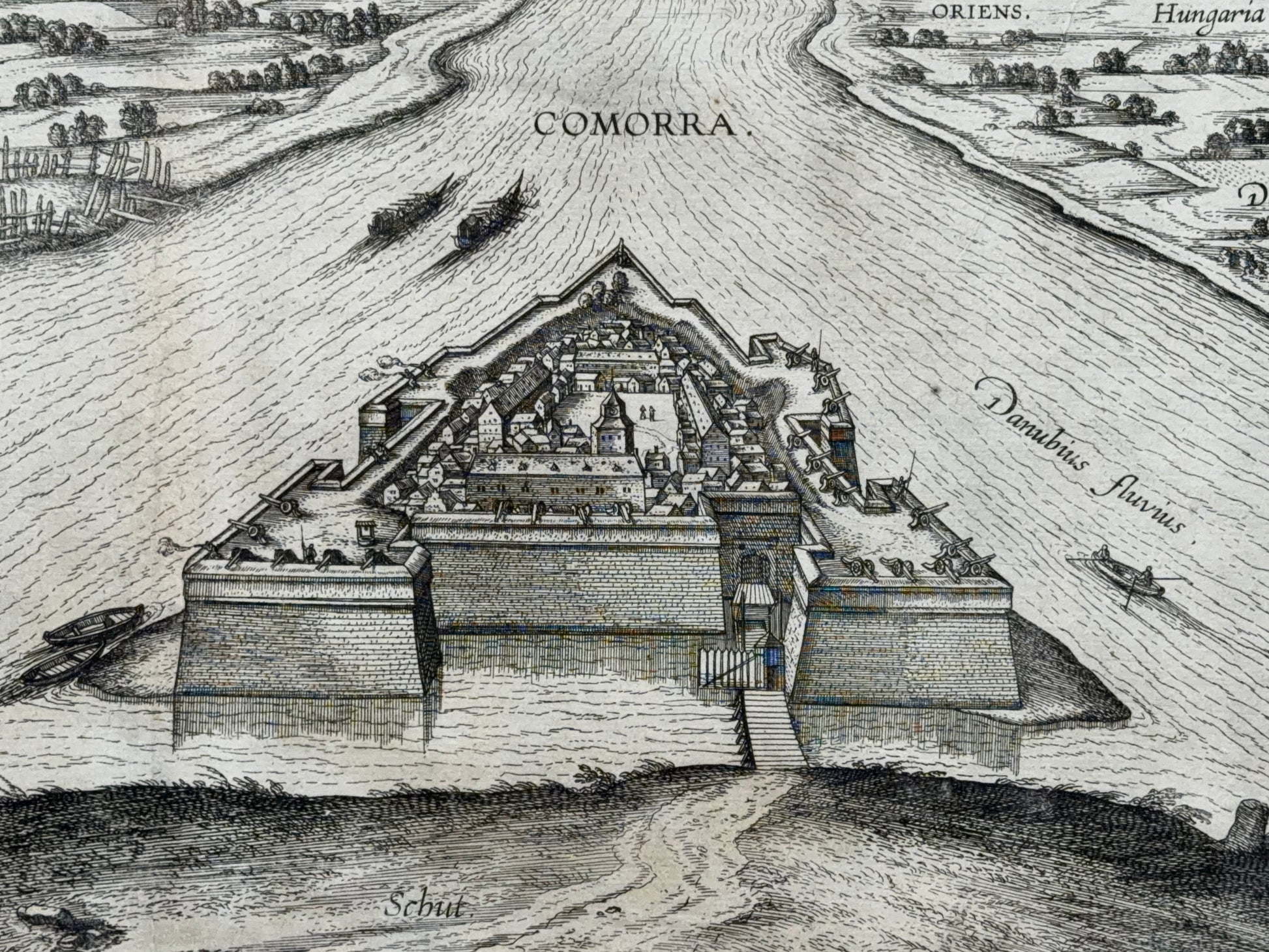 The engraving depicts the fortified town of Komárno (Latin: Comorra) located at the confluence of the Danube and Váh rivers during the Turkish wars. In the upper part of the engraving, to the right of the bastion fortress, is a depiction of the civilian town, whose origins date back to the 11th century, when a royal border fortress existed here. After the Tatar invasion in the 13th century, it was fortified and developed; the first written mention dates back to 1265.