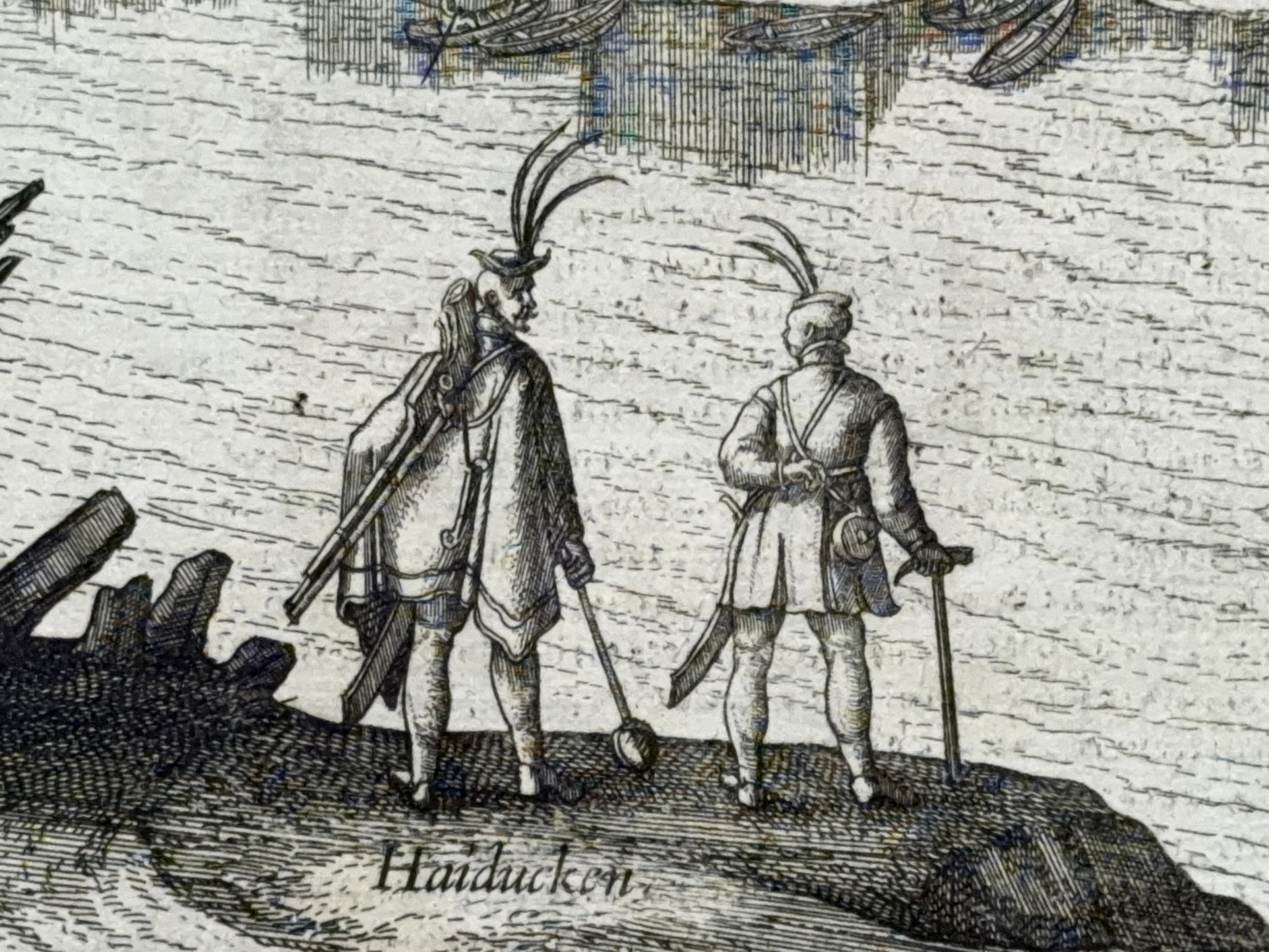 Both military and commercial vessels can be found on the Danube River, some of which are equipped with cannons. In the 16th century, several types of ships were used on the middle Danube. Light and fast boats designed for patrolling and transporting infantry were called seagulls (Hungarian: sajka) and were mainly used by units of so-called seagulls. Heavier river boats equipped with cannons served as gunboats and provided fire support to fortresses and shore units. In addition to these, flat-bottomed supply vessels suitable for shallower sections of the river were used to transport building materials, food, and military supplies. In the 16th century, the Danube was not only a line of defense but also a major logistical artery along which military units, artillery, and supplies were transported. The upper panel depicts bombing and military clashes on the water, underscoring the strategic importance of the city as a border fortress of the Kingdom of Hungary.